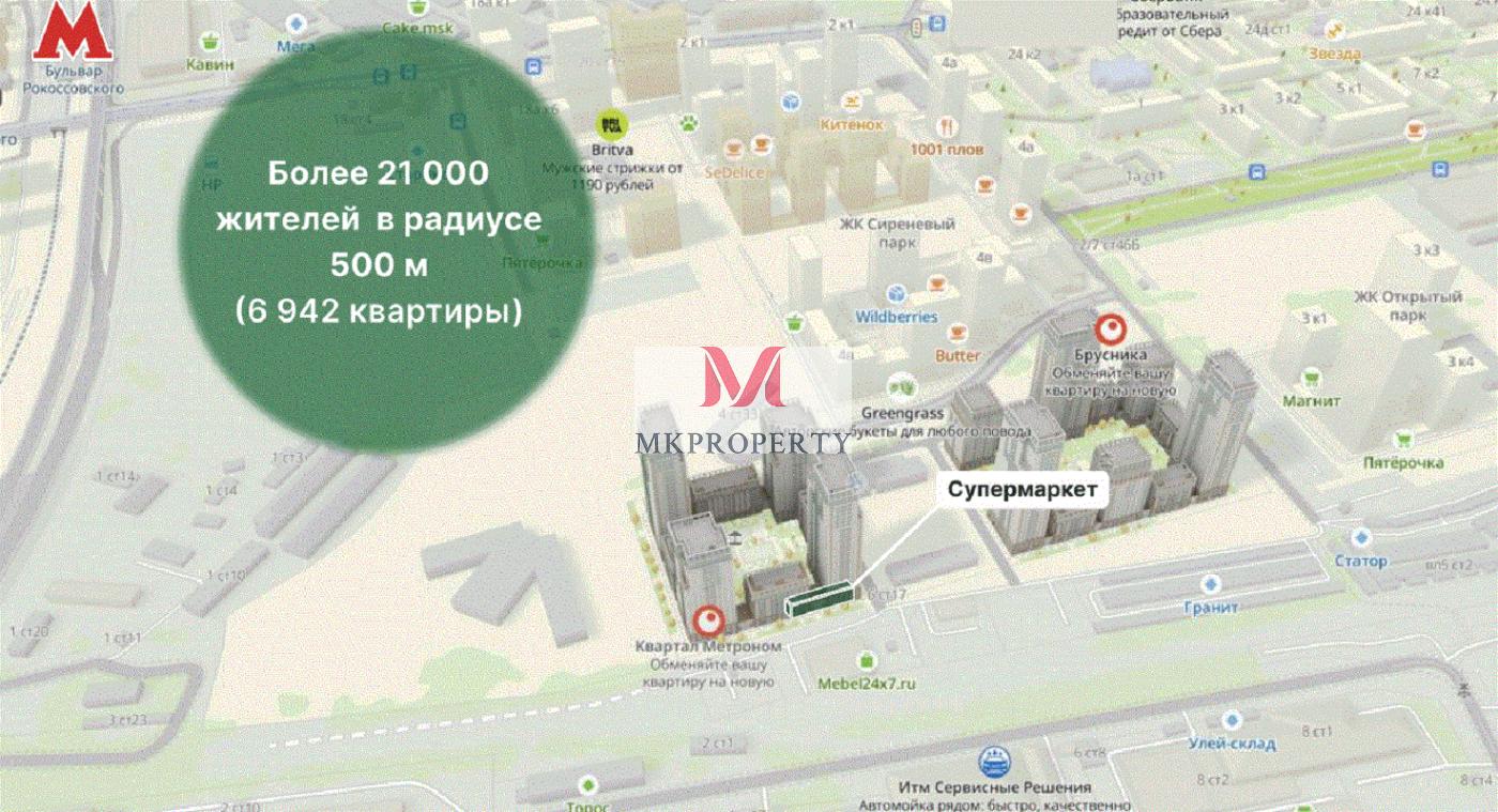 - Трафик: интенсивный автомобильный и пешеходный трафик, ЖК комфорт-класса на 2 628 квартир, все квартиры сдаются в предчистовой отделке, более 6 942 квартиры в радиусе 500 м.