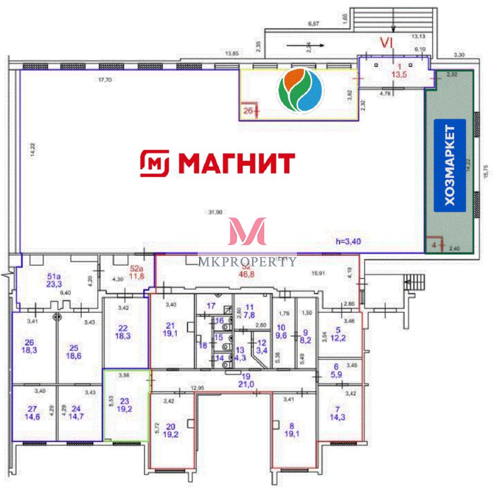 Данный объект недвижимости представляет собой торговое помещение площадью 51.1 квадратных метров с арендатором магазин "Хозмаркет".