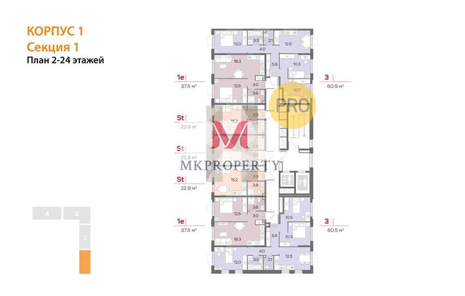 3-к.квартира 60.5 м², 24/24 эт. 23 438 123